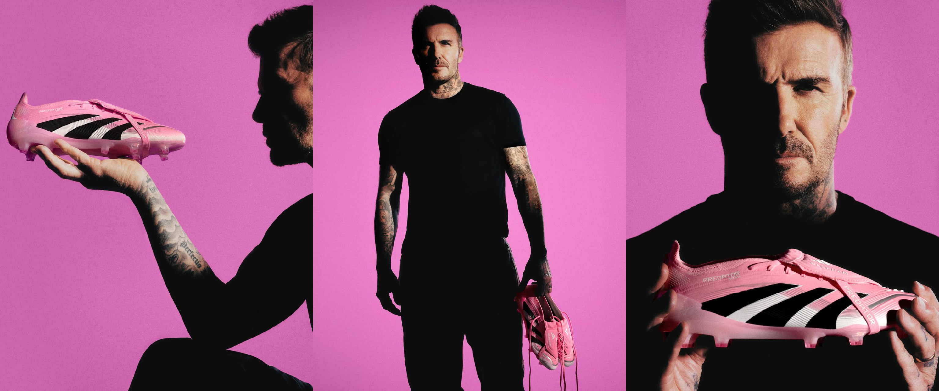 Бекхэм впервые надел розовые кроссовки Predator в 2011 году, в честь рождения своей дочери Харпер. Этот личный момент теперь возрождается в более элегантной и изысканной палитре. Новые бутсы выполнены в оттенках розового – яркого, конфетного – клубного цвета «Интер Майами», символом которого является фламинго. На поверхности ботинок присутствует незначительный серебристый элемент в виде волны, которая проходит по носку, а основные акценты выполнены черным: три полоски адидас и стельки, на одной из них вы можете прочитать название модели Предатор, а на другой фамилию Бекхэм. На откидном язычке рядом с логотипом Адидас также появилась фамилия Бекхэма, а в остальном привычный нам дизайн этой модели был сохранен.
