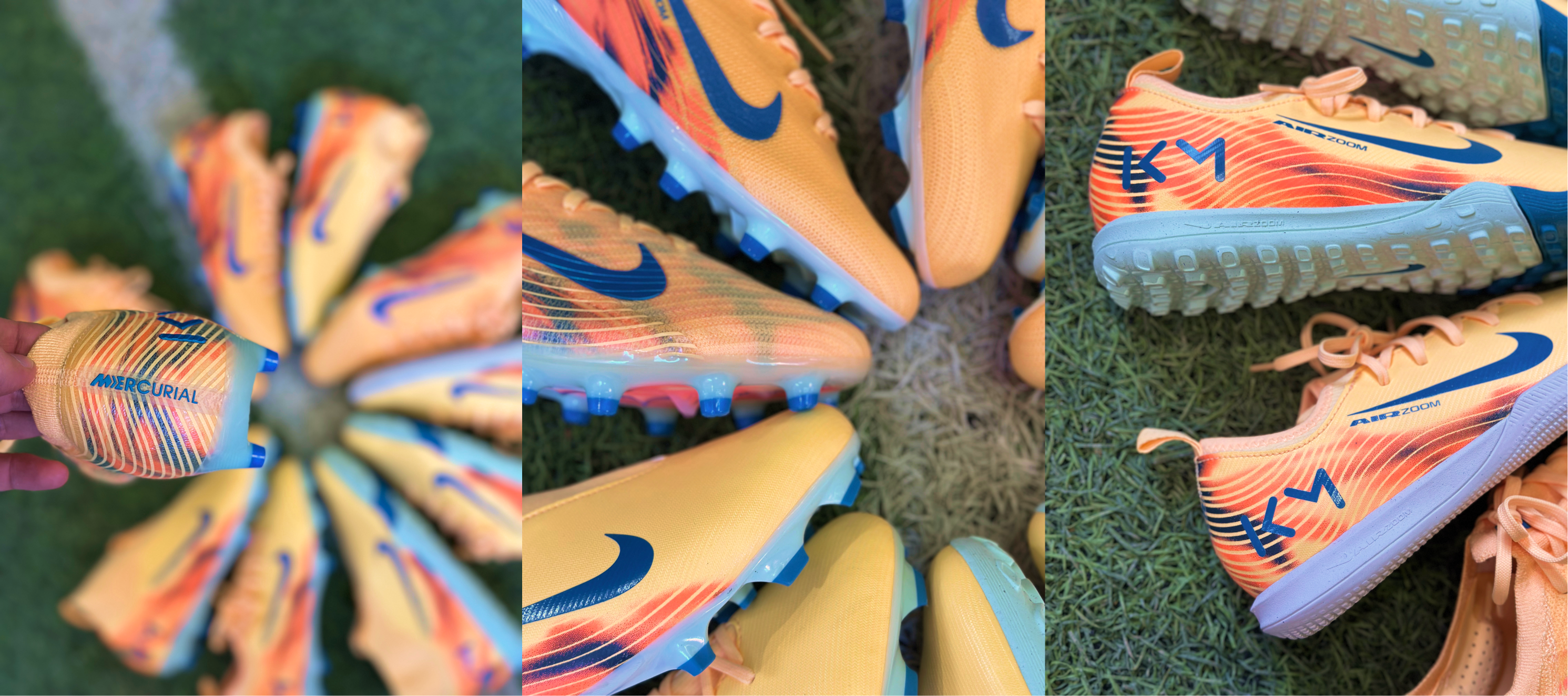 Новая коллекция выполнена в сочетании оранжевого, который носит название «Melon Tint» и голубого «Igloo» цветов, вместе создающих ощущение свежести и прохлады. В синем цвете «Neo Turquoise» сделаны Swoosh, наконечники шипов и фирменный логотип Мбаппе, который уже традиционно размещается на внешней стороне пятки.